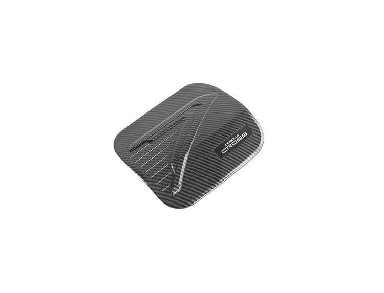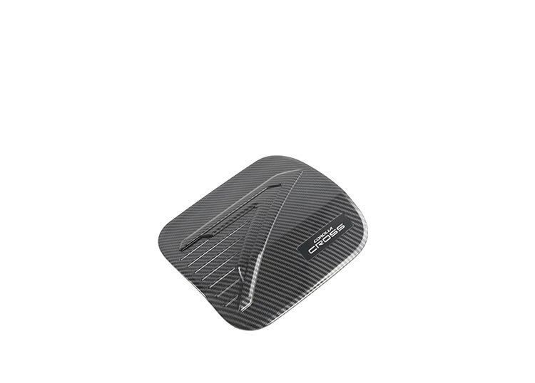 デザイン特徴: 項目: カーボンファイバー調デザインでスポーティな印象 項目: 車種専用設計で、カローラクロスの燃料タンクにぴったりフィット 項目: 貼り付けるだけで簡単に装着可能
