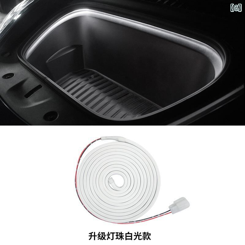 商品特徴・説明文: テスラ Model3およびModelYのフロントトランク用LEDライトです。柔らかいシリコンLED素材を使用しており、トランク内を明るく照らします。愛車のトランクをスタイリッシュにアップグレードしたい方におすすめです。取り付けは専用プラグ式で、Model3リフレッシュ版にはさらに便利な貼り付け式もご用意しています。ピュアホワイトとウォームホワイトの2種類の光色から、お好みに合わせてお選びいただけます。