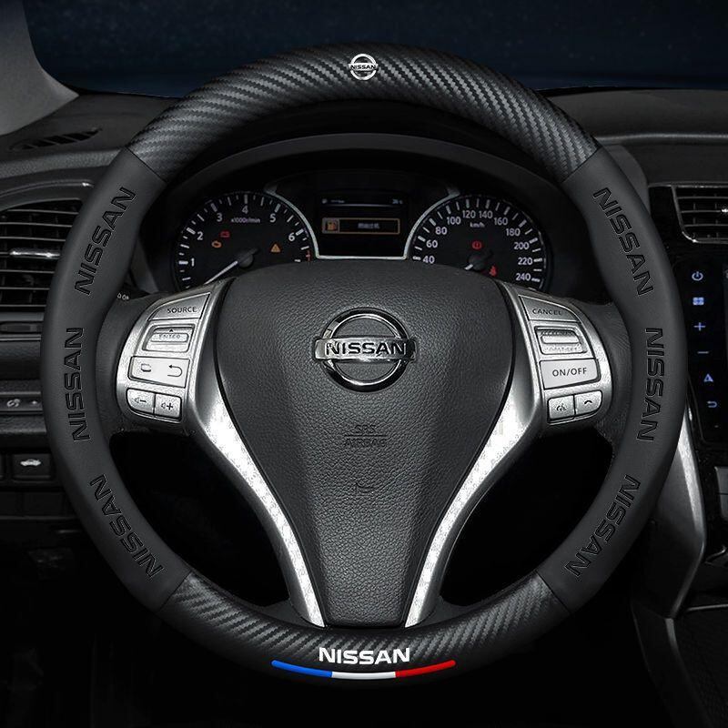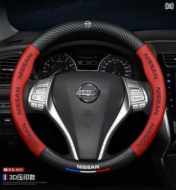 ハンドルカバー 日産 14代目 シルフィ ティアナ エクストレイル キャシュカイ ムラーノ ブルーバード サニー 対応 カーボンデザイン 牛革 3Dエンボス加工 円形 D型 ブラック レッド ブラウン 車載